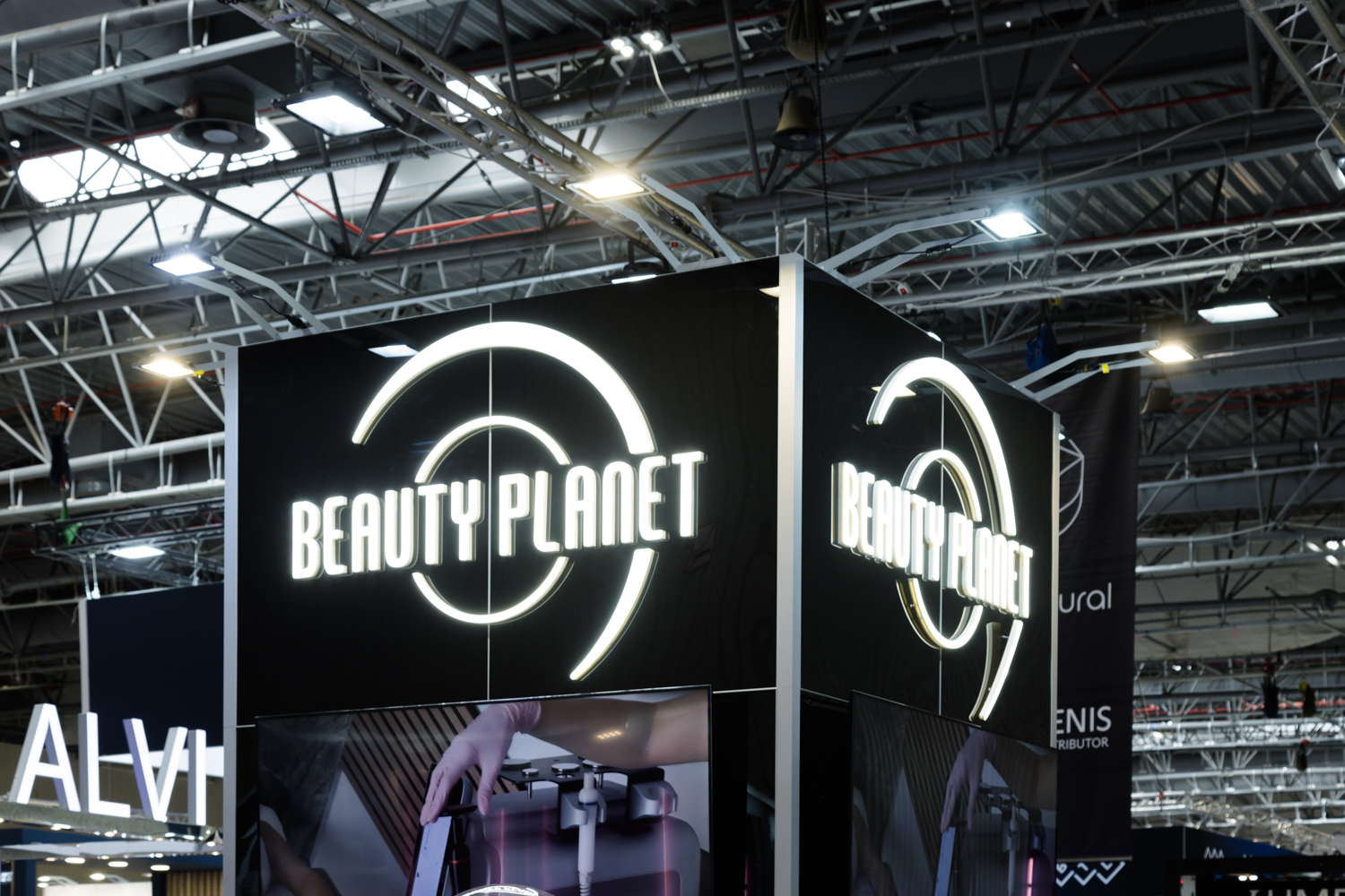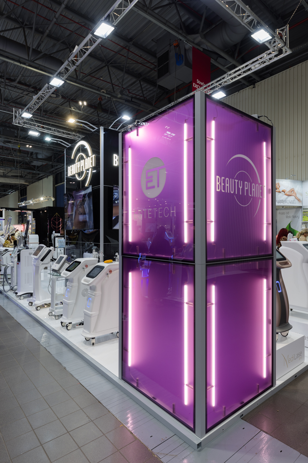 Stoisko na targi marki Estetech pokazuje, jak za pomocą koloru i światła można wykreować nowoczesną strefę wystawienniczą. Projekt zabudowy bazuje na połączeniu czerni i bieli, które stanowią neutralne tło dla głównego elementu dekoracyjnego – podświetlanych paneli w odcieniach fioletu. Dzięki zastosowaniu precyzyjnego, liniowego oświetlenia fiolet nie tylko ożywia przestrzeń, ale także nadaje jej dynamicznego, wręcz futurystycznego charakteru. Projekt Estetech to świetny przykład tego, że stoisko targowe nie musi być projektowane jako zwarty ciąg ścian – wolnostojące konstrukcje doskonale pełnią rolę ekspozycyjną, a ich główną zaletą jest to, że zachowują wizualną lekkość.