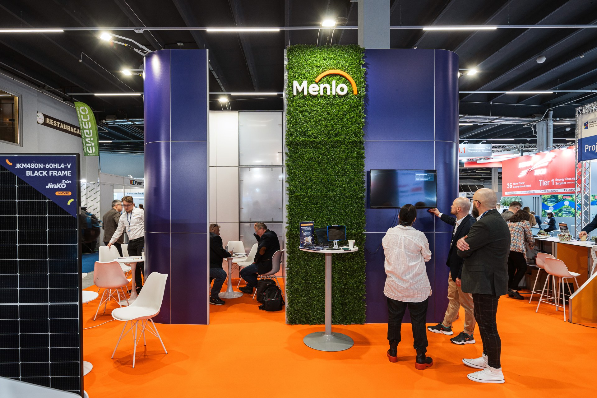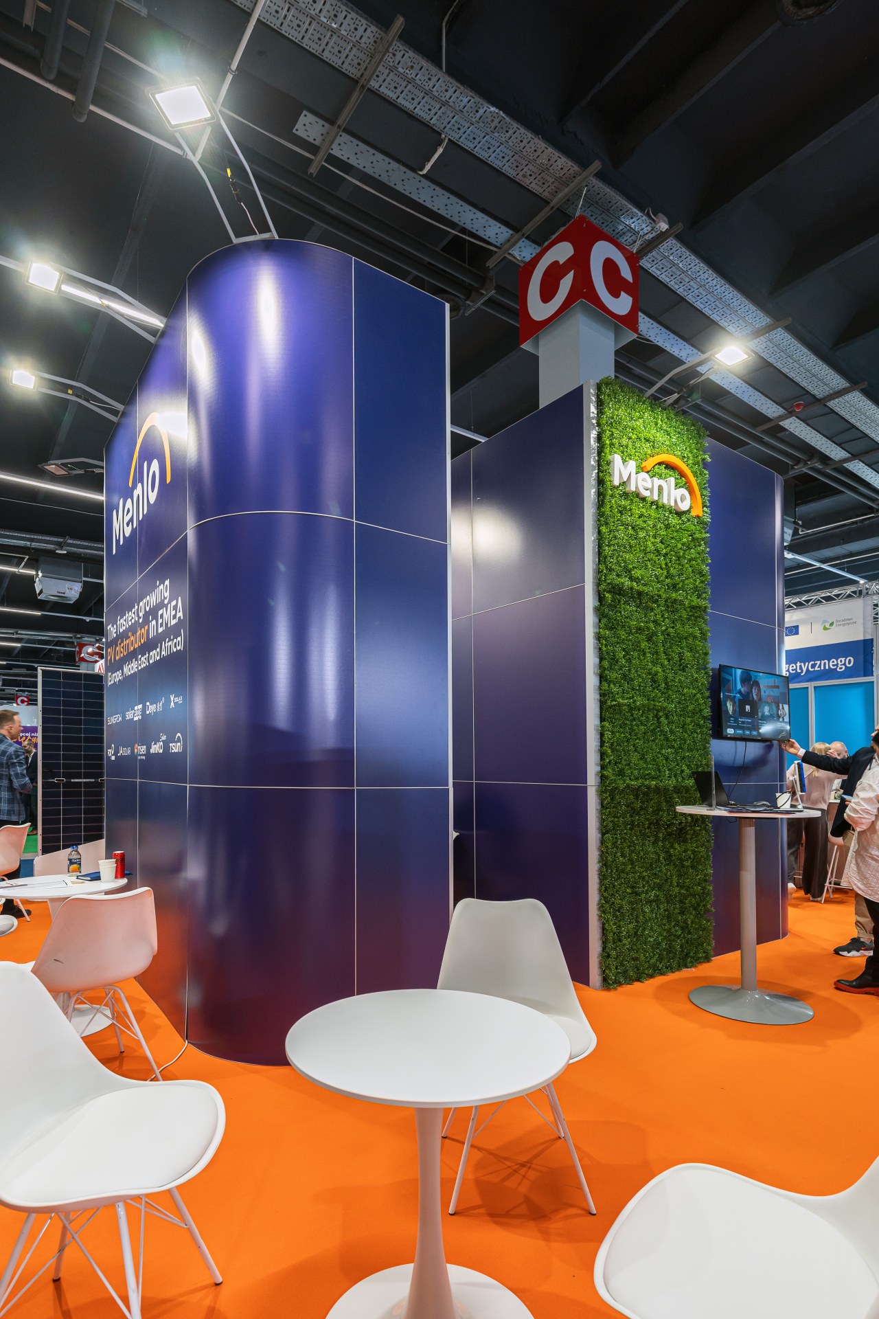 Menlo to marka z branży fotowoltaicznej, z którą współpracujemy przy wielu realizacjach targowych. Jej kolorowy, pozytywny branding doskonale komponuje się z naszym systemem modułowym, pozwalając tworzyć zupełnie różne formy zabudowy w zależności od wydarzenia. Wysokie konstrukcje w barwach marki zapewniają doskonałą widoczność na halach targowych, a modułowość umożliwia szybkie i ekonomiczne dostosowanie układu do nowej przestrzeni. Ściany stoiska stanowią minimalistyczne tło dla produktów, a zielone panele z bukszpanem – również wielokrotnego użytku – podkreślają ekologiczny charakter marki i jej związek z odnawialnymi źródłami energii.